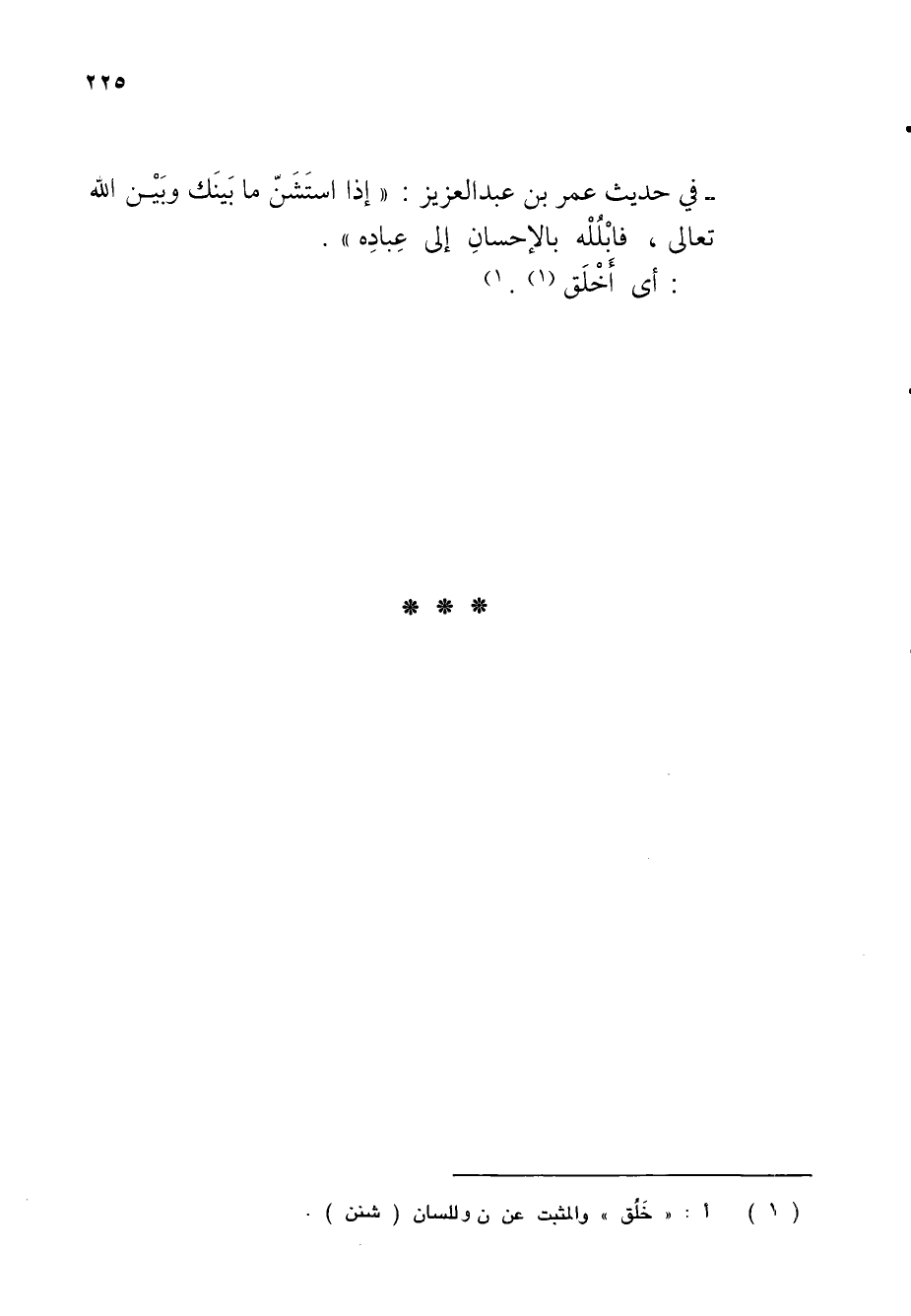 - في حديث عمر بن عبد العزيز: "إذا استَشَنّ ما بَينَك وبَيْن الله تعالى، فابْلُلْه بالإحسانِ إلى عِبادِه".