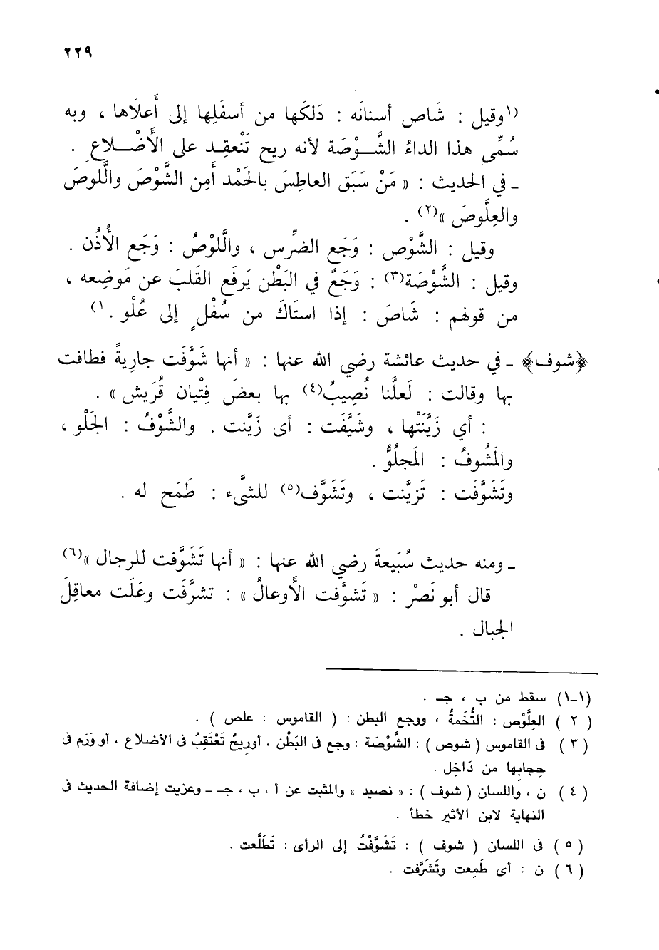 وقيل: الشَّوْص: وَجَع الضِّرس، والَّلوْصُ: وَجَع الأُذُن. وقيل: الشَّوْصَة (¬3): وَجَعٌ في البَطْن يَرفَع القَلبَ عن مَوضِعه، من قولهم: شَاصَ: إذا استَاكَ من سُفْلٍ إلى عُلْو. 1)