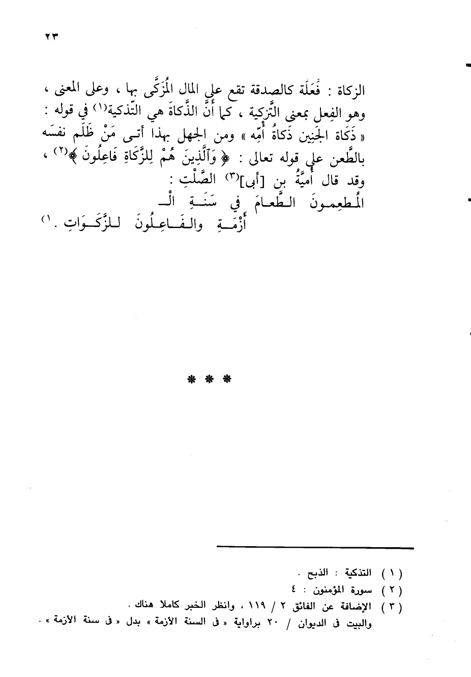الزكاة: فعَلَة كالصدقة تقع علِىِ المال المُزَكَّى بها، وعلى المعنى، وهو الفِعل بمعنى التَّزكية، كما أَنَّ الذَّكاةَ هي التّذكية (¬1) في قوله: "ذَكَاة الجَنِين ذَكاةُ أْمِّه" ومن الجهل بهذا أتى مَنْ ظَلَم نفسَه بالطَّعن على قوله تعالى: {وَالَّذِينَ هُمْ لِلزَّكَاةِ فَاعِلُونَ} (¬2)، وقد قال أُميَّةُ بن [أبي] (¬3) الصَّلْتِ:
