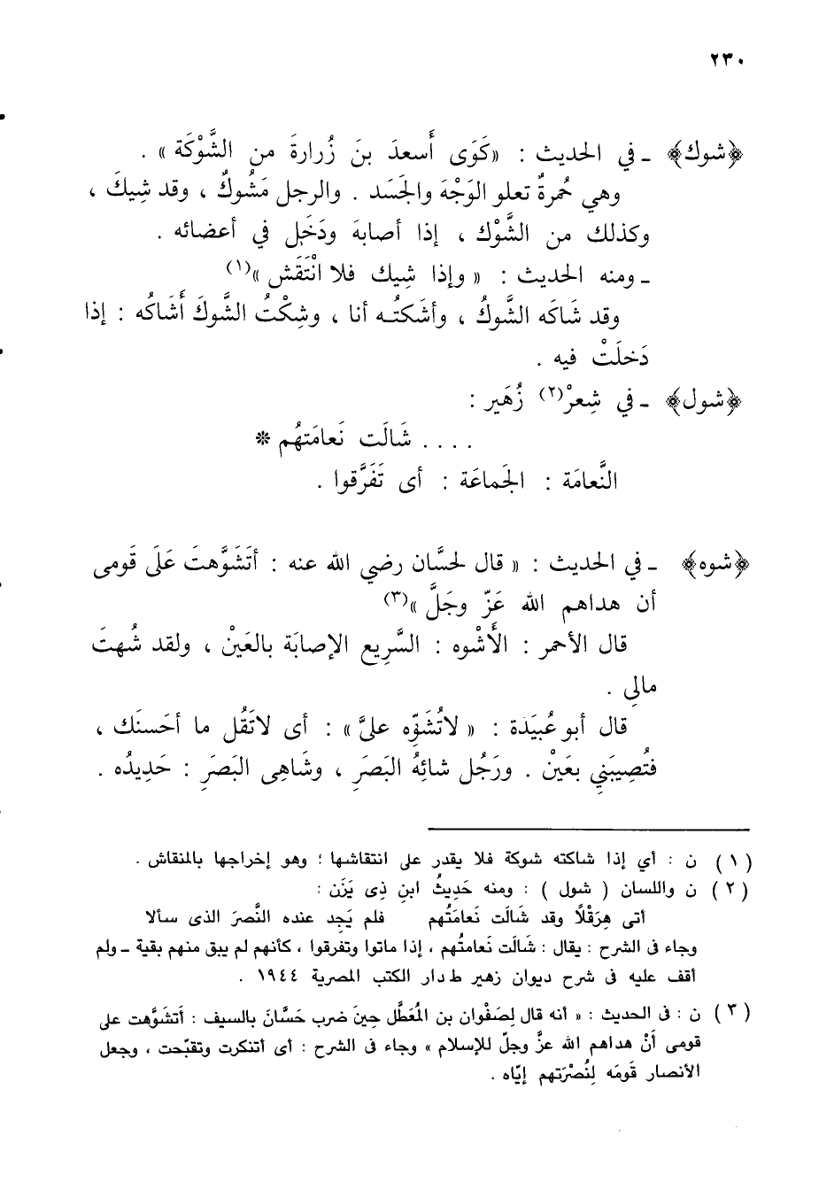 (¬3) ن: في الحديث: "أنه قال لِصَفْوان بن المُعَطَّل حِينَ ضرب حَسَّانَ بالسيف: أَتشَوَّهت على قومى أَنْ هداهم الله عزَّ وجلّ للإسلام" وجاء في الشرح: أي أتنكرت وتقبّحت، وجعل الأنصار قَومَه لِنُصْرَتهم إيّاه.