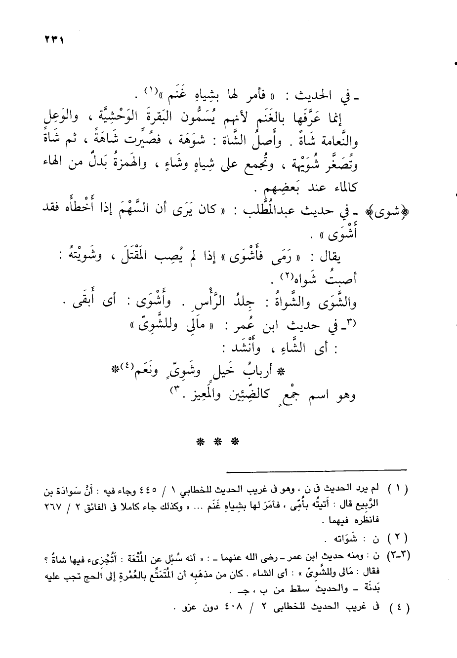(3 - 3) ن: ومنه حديث ابن عمر - رضي الله عنهما -: "أنه سُئِل عن المُتْعَة: أَتُجْزِىء فيها شاةُ؟ فقال: مَا لى وللشَّوىْ": أي الشاء. كان من مذهَبِه أن المُتَمَتِّع بالعُمْرةِ إلى الحج تجب عليه بَدنَة - والحديث سقط من ب، جـ.