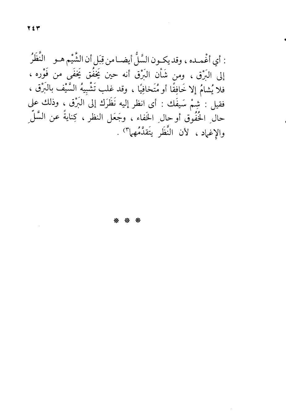 : أي أغْمده، وقد يكون السَّلُّ أيضا من قِبَل أن الشَّيْم هو النَّظَرُ إلى البَرْق، ومنِ شَأن البَرْق أنه حين يَخفُق يَخفَى من فَوْره، فلا يُشامُ إلا خَافِقًا أو مُتَخافِيًا، وقد غلب تَشْبِيهُ السَّيْف بالبَرْق، فقيل: شِمْ سَيفَك: أي انظر إليه نَظَرَك إلى البَرْق، وذلك على حالِ الخُفُوق أو حالِ الخَفاء، وجَعَل النظر، كِنايةً عن السَّلِّ والِإغماد، لأن النَّظَر يتَقدَّمُهما 3).