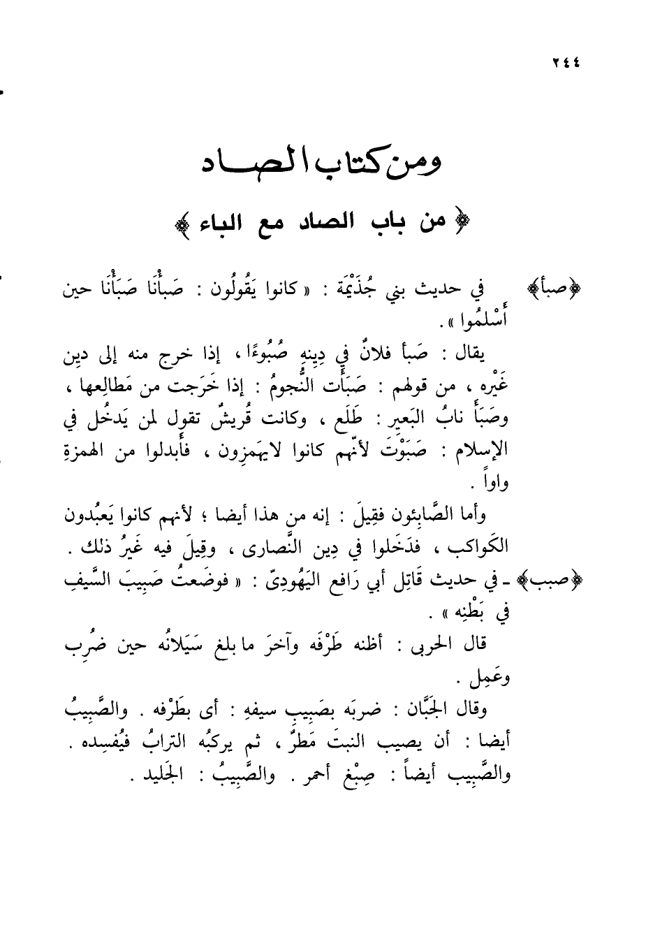 يقال: صَبأ فلانٌ في دِيِنهِ صُبُوءًا، إذا خرج منه إلى ديِن غَيْره، من قولهم: صَبَأَت النُّجومُ: إذا خَرَجت من مَطالِعها، وصَبَأَ نابُ البَعيِر: طَلَع، وكانت قُريشٌ تقول لمن يَدخُل في الإسلام: صَبَوْتَ لأنّهم كانوا لا يهَمزِون، فأَبدلوا من الهمزةِ واواً.