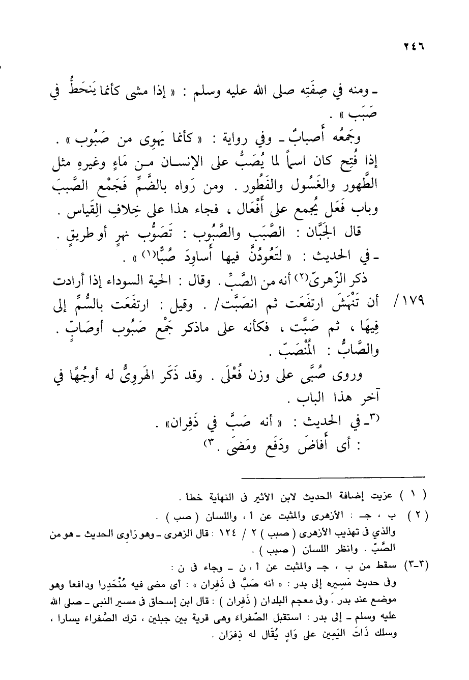 وفي حديث مَسِيرِه إلى بدر: "أنه صَبَّ في ذَفِران": أي مضى فيه مُنْحَدِرا ودافعا وهو موضع عند بدر. وفي معجم البلدان (ذَفِران): قال ابن إسحاق في مسير النبى - صلى الله عليه وسلم - إلى بدر: استقبل الصّفراءَ وهي قرية بين جبلين، ترك الصَّفراءَ يسارا، وسلك ذَاتَ اليَمِين على وَادٍ يُقَال له ذِفرَان.