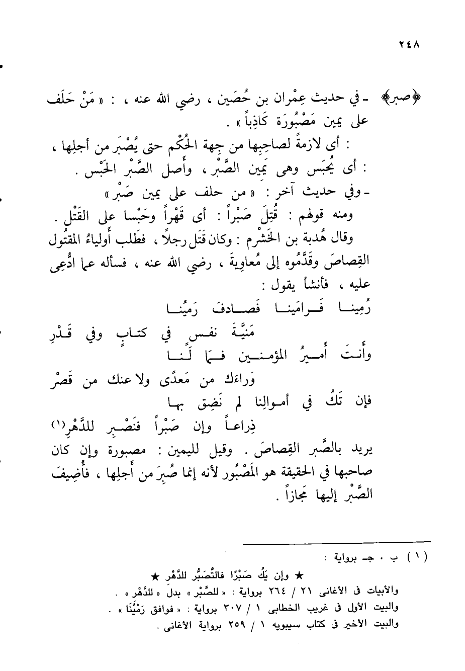 يريد بالصَّبر القِصاصَ. وقيل لليمين: مصبورة وإن كان صاحبها في الحقيقة هو المَصْبُور لأنه إنما صُبِرَ من أَجلِها، فأُضِيفَ الصَّبْر إليها مَجازاً.