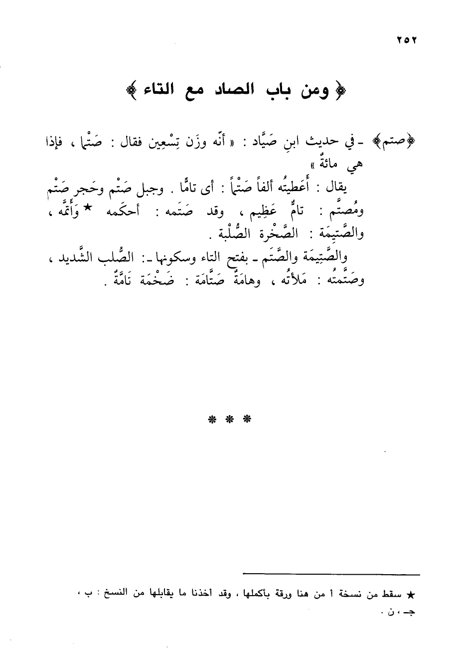 (صتم) - في حديث ابنِ صَيَّاد: "أنّه وزَن تِسْعِين فقال: صَتْما، فإذا هي مائةٌ"