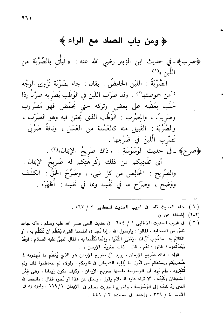 (¬3) في غريب الحديث للخطابى 1/ 654: في حديث النبى - صلى الله عليه وسلم -: "أنه جاءه ناسٌ من أصحابه، فقالوا: يا رسول الله، إنا نَجِد في أنفسنا الشىءَ يَعْظُم أن نَتَكلَّم به، أو الكلامَ به، ما نُحِب أَنَّ لنا، يَعْنىِ الدُّنْيا، وإنّما تَكَلَّمنا به، فقال النبىُّ عليه السلام، أوقَدْ وَجَدْتُموه؟ قالوا: نَعُم، قال: ذاك صرَيحُ الإيمان".