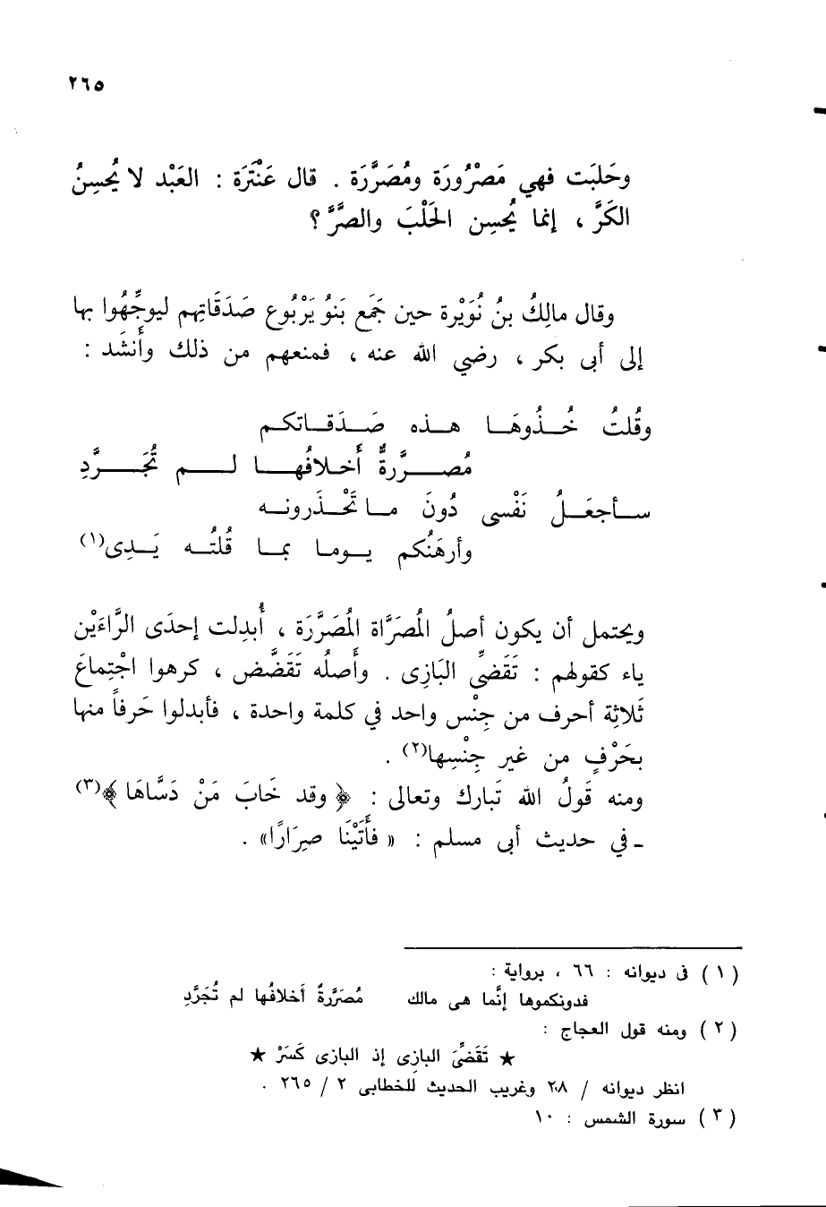 ويحتمل أن يكون أصلُ المُصَرَّاة المُصَرَّرَة، أُبدِلت إحدَى الرَّاءَيْن ياء كقولهم: تَقَضىِّ البَازِى. وأَصلُه تَقَضَّض، كرهوا اجْتِماعَ ثَلاثِة أحرف من جِنْس واحد في كلمة واحدة، فأبدلوا حَرفاً منها بحَرْفٍ من غير جِنْسِها (¬2).