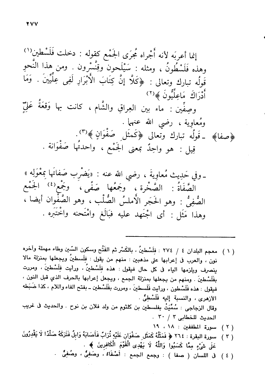 (¬1) معجم البلدان 4/ 274: فِلَسْطينُ، بالكَسرْ ثم الفَتْح وسكون السّين وطاء مهملة وآخره نون، والعرب في إعرابها على مذهبين: منهم من يقول: فِلَسطينُ ويجعلها بمنزلة ما لا ينصرف ويلزمها الياء في كل حال فيقول: هذه فِلَسْطينُ، ورأيت فِلَسْطينَ، ومررت بفَلَسْطينَ. ومنهم من يجعلها بمنزلة الجمع، ويجعل إعرابها بالحرف الذي قبل النون، فيقول: هذه فَلَسْطون، ورأيت فَلَسطينَ، ومررت بفَلَسْطين - بفتح الفاء واللام، كذا ضَبَطه الأزهرى، والنسبة إليه فَلَسْطِىٌّ.