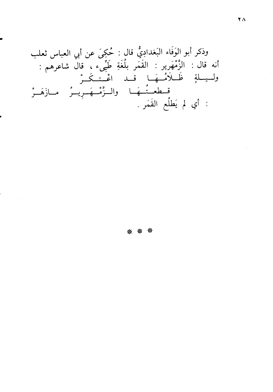 وذكر أبو الوَفَاء البَغدادِيُّ قال: حُكِىَ عن أبي العباس ثعلب أنه قال: الزَّمْهَرير: القَمَر بلُغَةِ طَيَّئ، قال شاعرهم:
