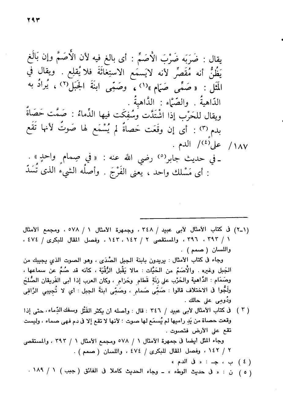 (¬1) في كتاب الأمثال لأبى عبيد/ 348، وجمهرة الأمثال 1/ 578، ومجمع الأمثال 1/ 393، 396، والمستقصى 2/ 142، 143، وفصل المقال للبكرى/ 474، واللسان (صمم).