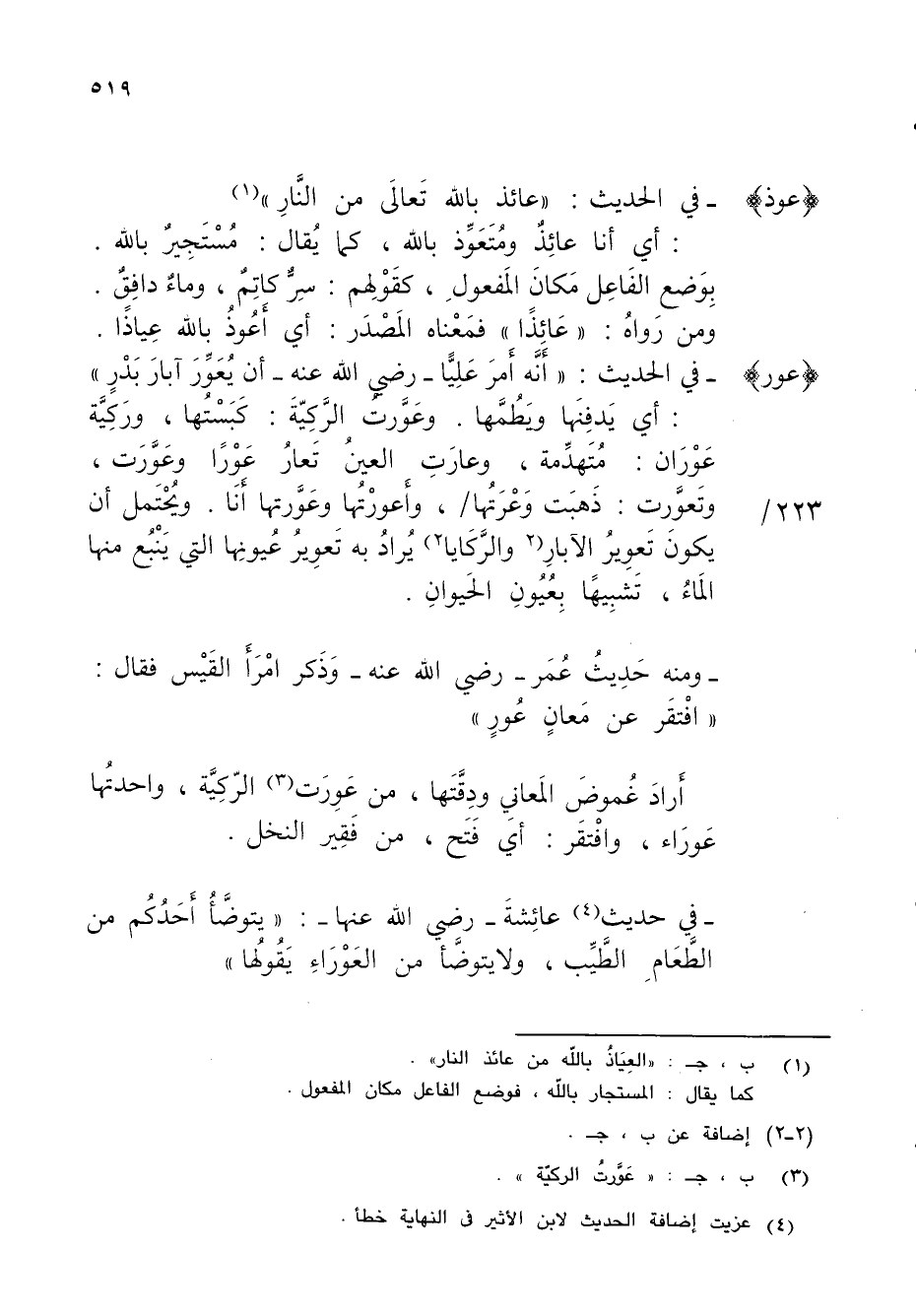 : أي يَدفِنَها وَيطُمَّها. وعَوَّرت الرَّكِيّةَ: كَبَسْتُها، ورَكِيَّة عَوْرَان: مُتَهدِّمة، وعارَتِ العينُ تَعارُ عَوْرًا وعَوَّرَت، وتَعوَّرت: ذَهبَت وَعْرَتُها، وأَعورْتُها وعَوَّرتها أَنَا. ويُحْتَمل أن يكون تَعوِيرُ الآبارِ (2 والرَّكَايا 2) يُرادُ به تَعوِيرُ عُيونِها التي يَنْبُع منها المَاءُ، تَشبِيهًا بِعُيُونِ الحَيوانِ.