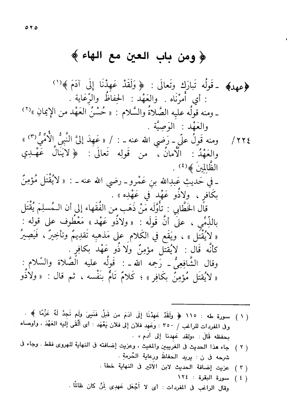 ومنه قَولُ علّى - رَضي الله عنه -: "عَهِدَ إلىَّ النَّبِىُّ الأُمِّيُّ (¬3) " والعَهْدُ: الأَمانُ، من قَولِه تَعالَى: {لا يَنَالُ عَهْدِي الظَّالِميِنَ} (¬4).