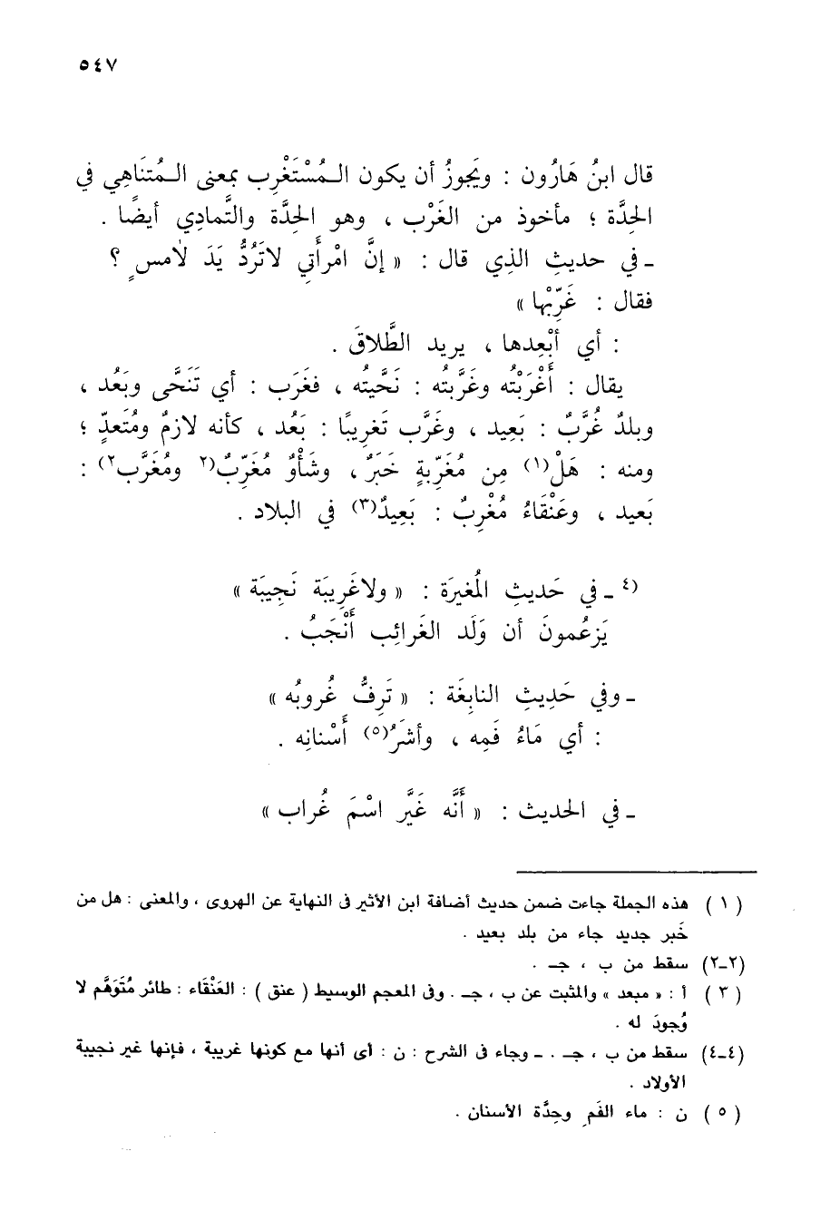 قال ابنُ هَارُون: ويَجوزُ أن يكون المُسْتَغْرِب بمعنى المُتنَاهِي في الحِدَّة؛ مأخوذ من الغَرْب، وهو الحِدَّة والتَّمادِي أيضًا.