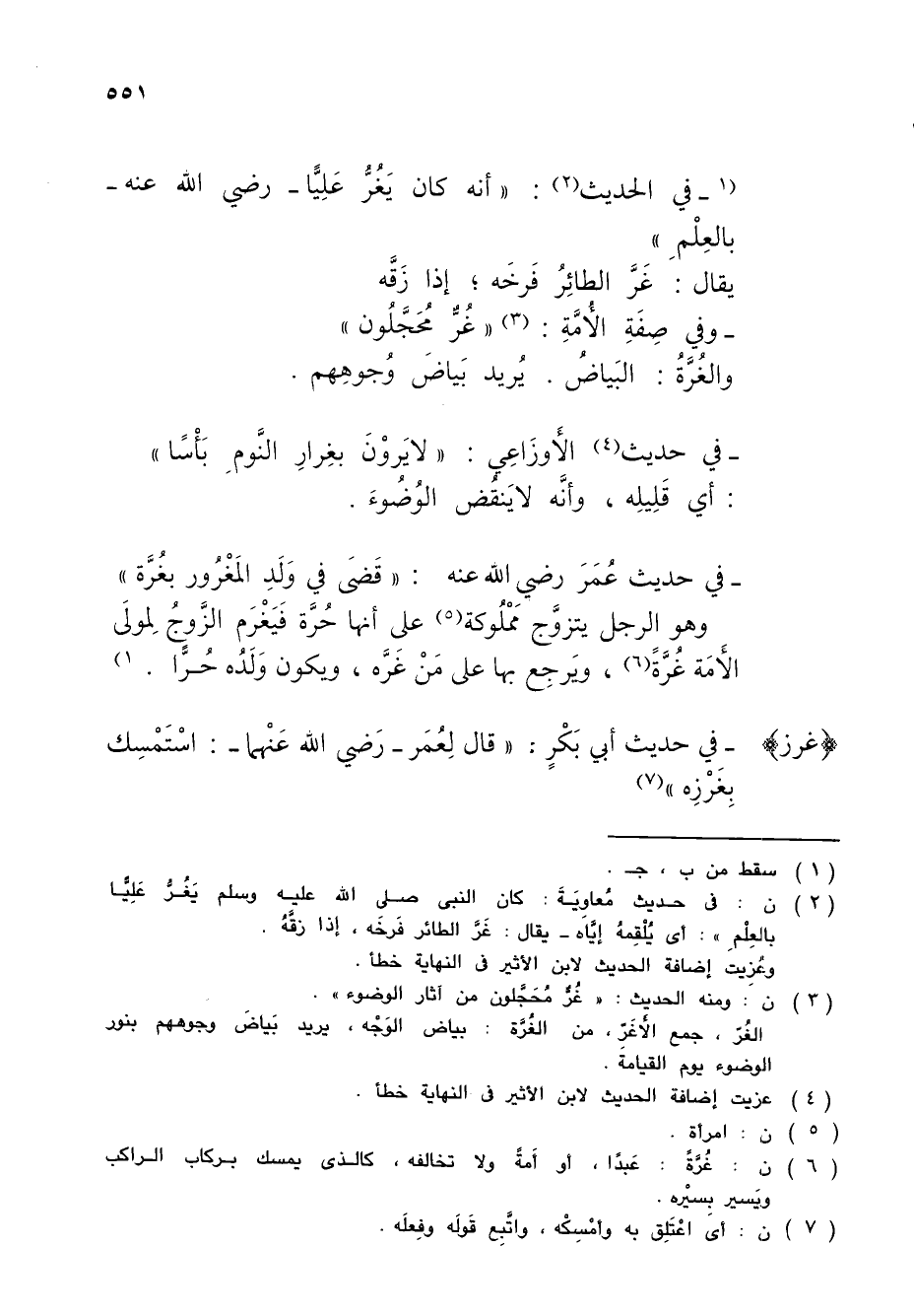 (¬3) ن: ومنه الحديث: "غُرٌّ مُحَجَّلون من آثار الوضوء".