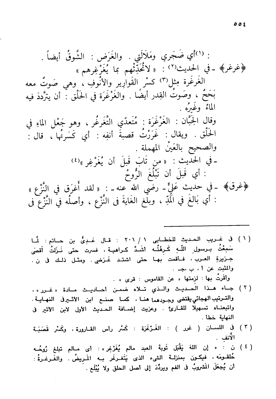 (¬2) جاء هذا الحديث والذي تلاه ضمن أحاديث مادة "غرر"، والترتيب الهجائي يقتضى وجودهما هنا، كما صنع ابن الأثير في النهاية. واتبعناه تسهيلا للقارئ. وعزيت إضافة الحديث الأول لابن الأثير في النهاية خطأ.