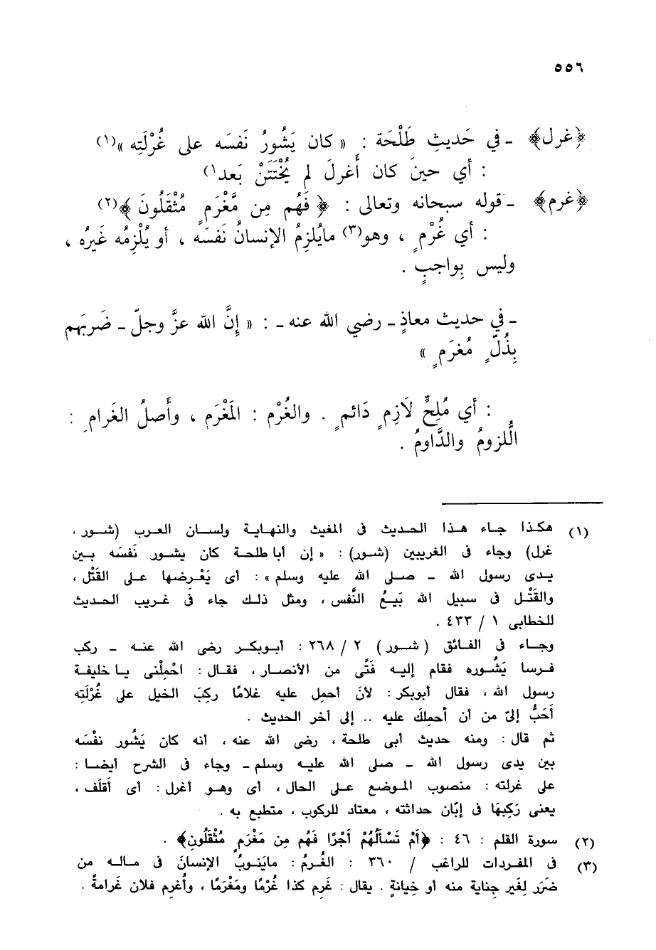(¬3) في المفردات للراغب / 360: الغُرمُ: ما يَنوبُ الإنسانَ في ماله من ضَرَر لِغَير جِناية منه أو خِيانةٍ. يقال: غَرِم كذا غُرْمًا ومَغْرَمًا، وأُغرِم فلان غَرامةً.