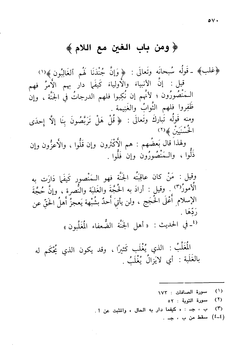 (غلب) - قَولُه سُبحانَه وتَعالَى: {وَإِنَّ جُنْدَنَا لَهُمُ الْغَالِبُونَ} (¬1)