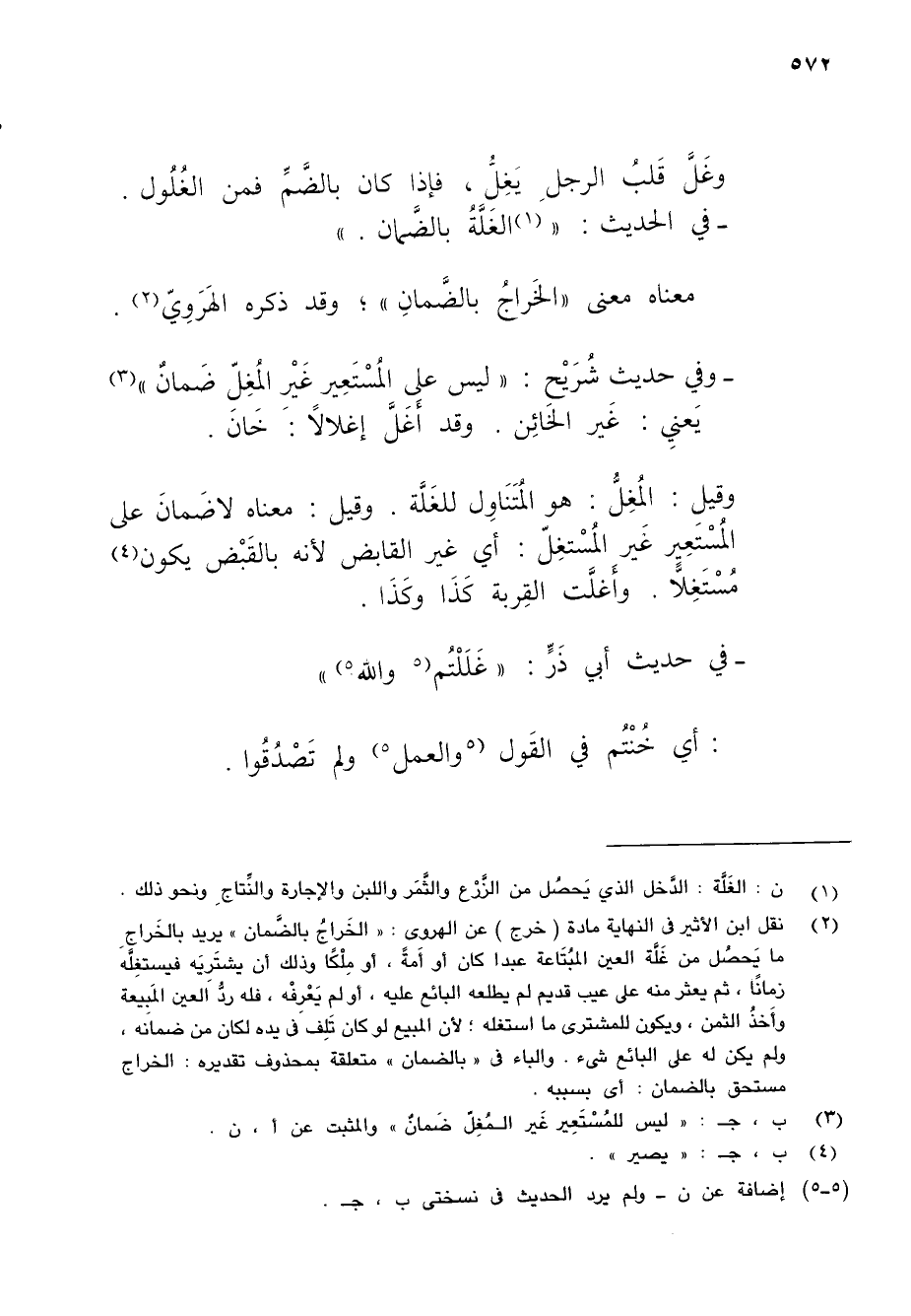 (¬2) نقل ابن الأثير في النهاية مادة (خرج) عن الهروى: "الخَراجُ بالضَّمان" يريد بالخَراجِ ما يَحصُل من غَلَّة العين المبُتَاعة عبدا كان أو أَمةً، أو مِلْكًا وذلك أن يشتَرِيَه فيستغِلَّه زمانًا، ثم يعثر منه على عيب قديم لم يطلعه البائع عليه، أو لم يَعْرِفْه، فله ردُّ العين المَبِيعة وأَخذُ الثمن، ويكون للمشترى ما استغله؛ لأن المبيع لو كان تَلِفَ في يده لكان من ضمانه، ولم يكن له على البائع شىء. والباء في "بالضمان" متعلقة بمحذوف تقديره: الخراج مستحق بالضمان: أي بسببه.
