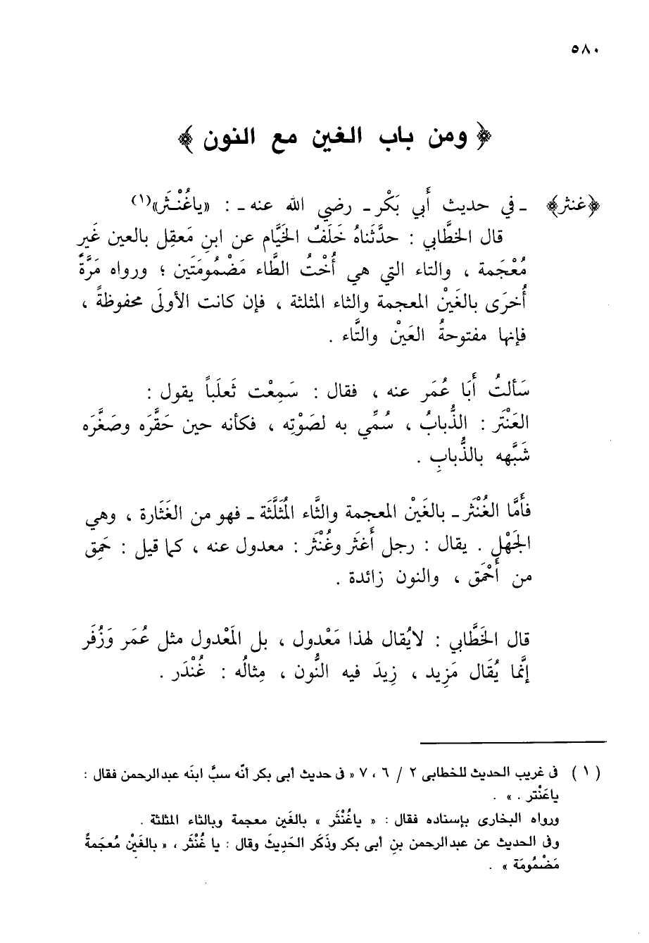 فأَمَّا الغُنْثَر - بالغَيْن المعجمة والثَّاء المُثَلَّثَة - فهو من الغَثَارة، وهي الجَهْل. يقال: رجل أَغثَر وغُنْثَر: معدول عنه، كما قيل: حَمِق من أَحْمَق، والنون زائدة.