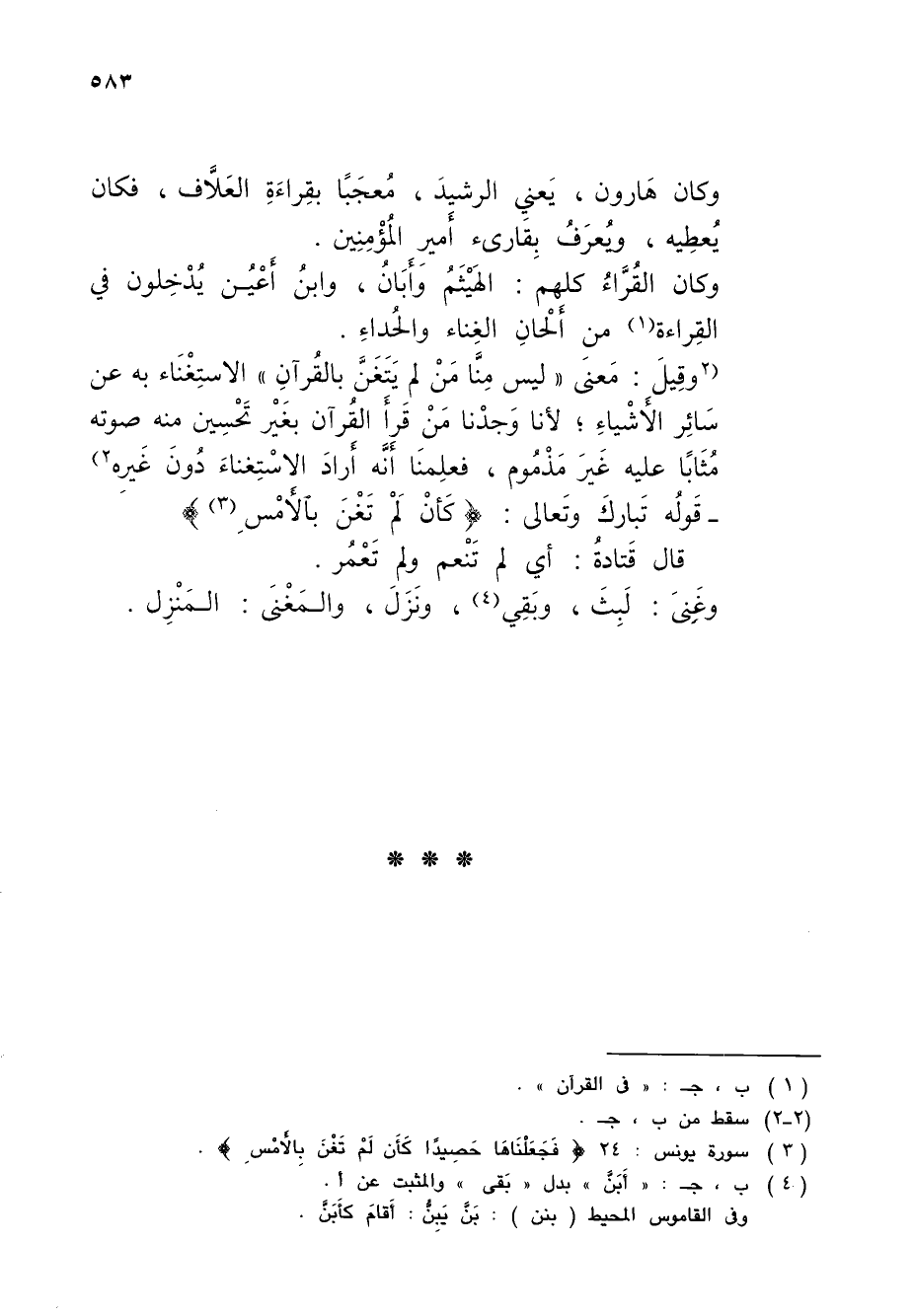 (2 وقِيلَ: مَعنَى "ليس مِنَّا مَنْ لم يَتَغَنَّ بالقُرآنِ" الاستِغْنَاء به عن سَائِر الأَشْياءِ؛ لأنا وَجدْنا مَنْ قَرأَ القُرآن بغَيْر تَحْسِين منه صوته مُثَابًا عليه غَيرَ مَذْمُوم، فعلِمنَا أَنَّه أَرادَ الاسْتِغناءَ دُونَ غَيرِه 2)