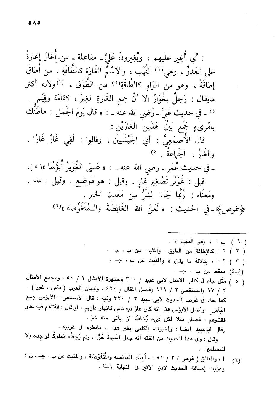 : أي أُغِير عليهم، ويُغِيرونَ عَليَّ - مفاعلة - من أَغارَ إغارةً على العَدوِّ، وهي (¬1) النَّهْب، والاسْمُ الغَارَة كالطَّاقَةِ، من أَطاقَ إطاقَةً، وهو من الوَاوِ كالطَّاقَةِ (¬2) من الطَّوْق، (¬3) ولأنه أكثر ما يقال: رَجلٌ مِغْوَارٌ إلا أنّ جمع الغَارةِ الغِيرَ، كقامَة وقِيَم.