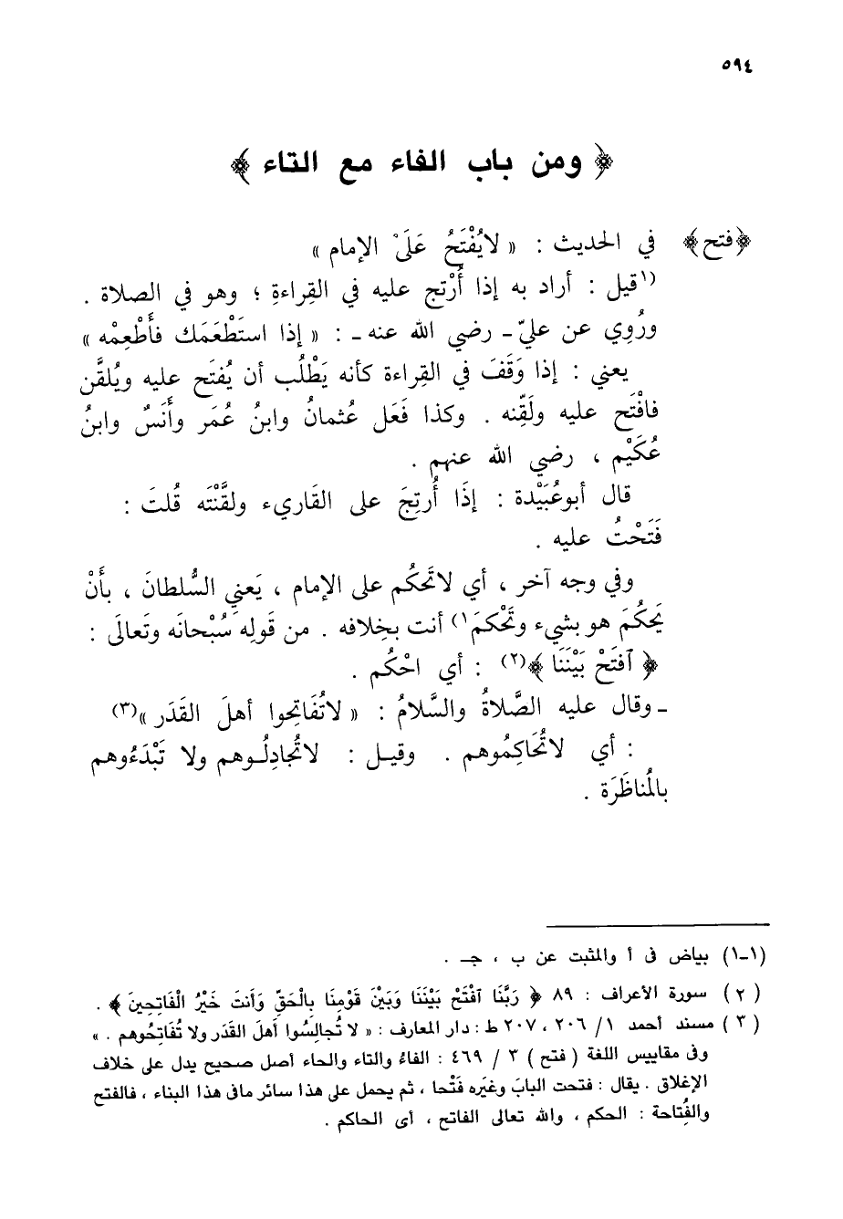 (¬3) مسند أحمد 1/ 206, 207 ط: دار المعارف: "لا تُجالِسُوا أَهلَ القَدَر ولا تُفَاتِحُوهم." وفي مقاييس اللغة (فتح) 3/ 469: الفاءُ والتاء والحاء أصل صحيح يدل عل خلاف الإغلاق. يقال: فتحت البابَ وغيَره فَتْحا، ثم يحمل على هذا سائر ما في هذا البناء، فالفتح والفُتاحة: الحكم، والله تعالى الفاتح، أي الحاكم.