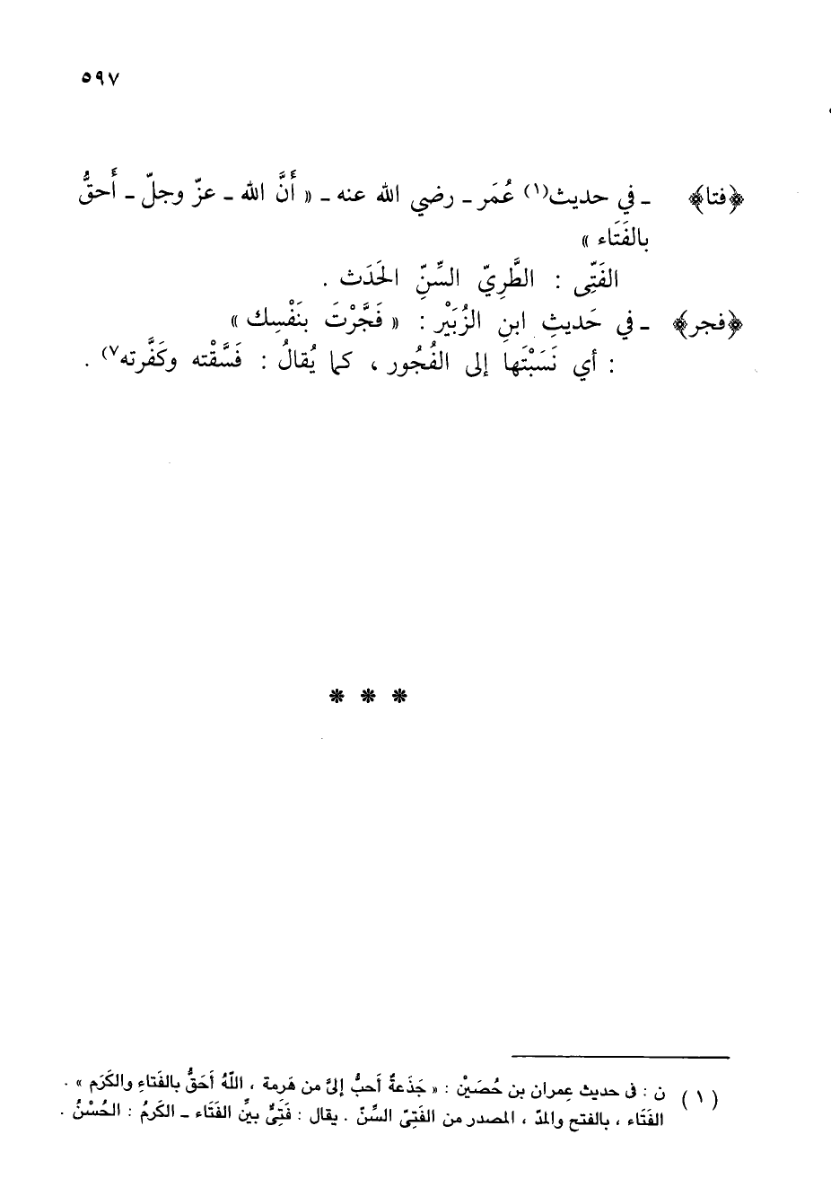 (¬1) ن: في حديث عِمران بن حُصَينْ: "جَذَعةٌ أَحبُّ إلىَّ من هَرِمة، اللهُ أَحَقُّ بالفَتاءِ والكَرَم". الفَتَاء، بالفتح والمدّ، المصدر من الفَتِىّ السِّنّ. يقال: فَتِىٌّ بين الفَتَاء - الكَرمُ: الحُسْنُ.