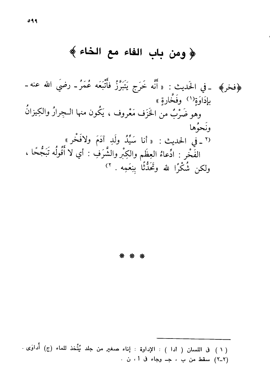 (فخر) - في الحَديث: "أَنَّه خَرَج يَتَبَرَّزُ فأَتْبَعَه عُمَرُ - رضَي الله عنه - بإدَاوَةٍ (¬1) وفَخَّارةٍ"