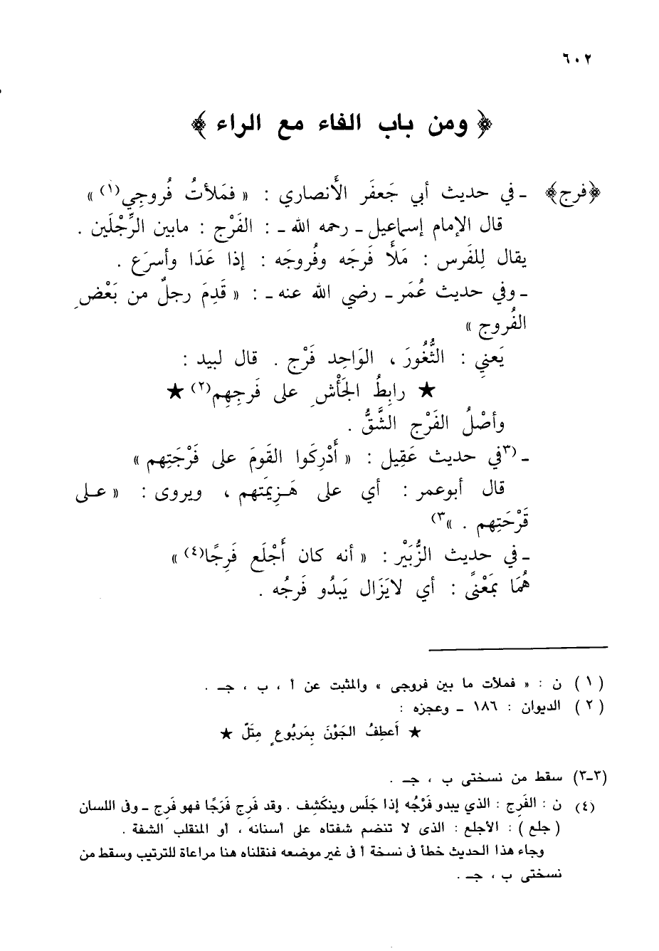 (¬4) ن: الفَرِج: الذي يبدو فَرْجُه إذا جَلَس وينكَشِف. وقد فَرِج فَرَجًا فهو فَرِج - وفي اللسان (جلع): الأجلع: الذي لا تنضم شفتاه على أسنانه، أو المنقلب الشفة.