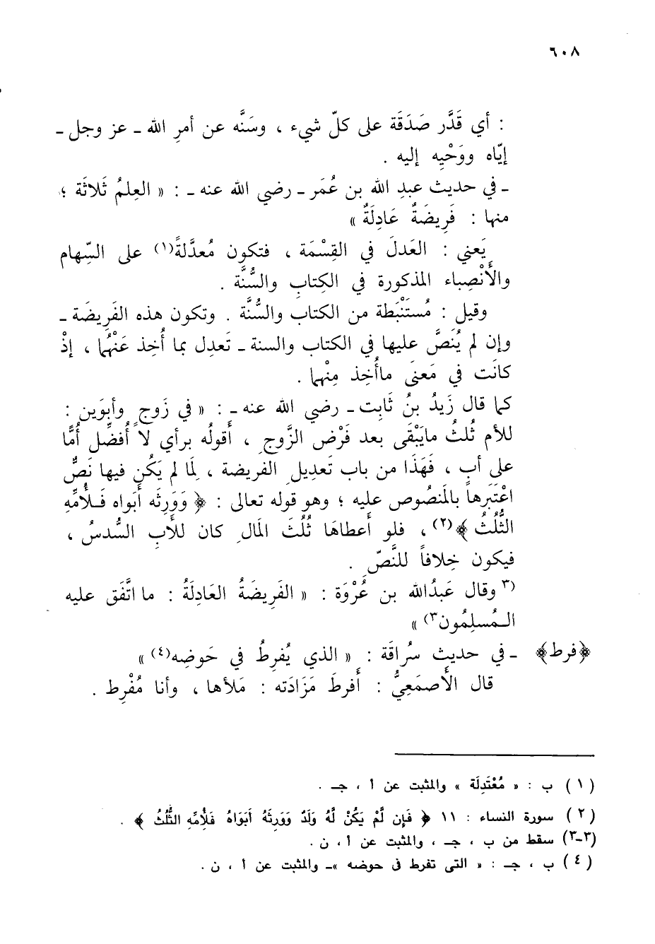 - في حديث عبدِ الله بن عُمَر - رضي الله عنه -: "العِلمُ ثَلاثَة؛ منها: فَرِيضَةٌ عَادِلَةٌ"