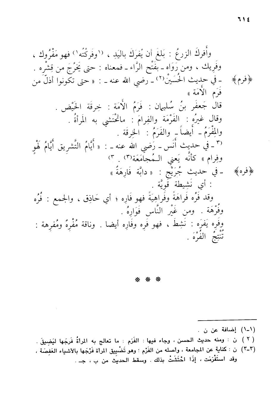 (3 - في حديث أَنَس - رَضي الله عنه -: "أَيَّامُ التَّشرِيق أَيَّامُ لَهْوٍ وفِرام" كأنَّه يَعني المُجامَعَة (3). 3)