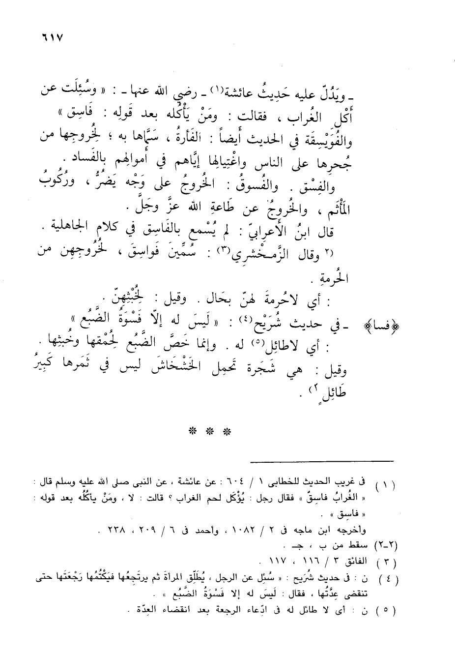 (¬1) في غريب الحديث للخطابى 1/ 604: عن عائشة، عن النبى صلى الله عليه وسلم قال: "الغُرابُ فاسِقٌ" فقال رجل: يُؤْكَل لحم الغراب؟ قالت: لا، ومَنْ يأكُلُه بعد قوله: "فاسِق".