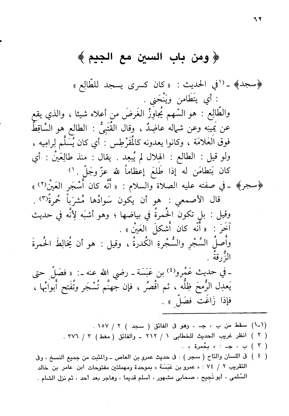 (¬4) في اللسان والتاح (سجر): في حديث عمرو بن العاص - والمثبت من جميع النسخ، وفي التقريب 2/ 74: "عمرو بن عَبَسَة" بموحدة ومهملتين مفتوحات ابن عامر بن خالد السّلمى، أبو نَجِيح، صحابى مشهور، أسلم قديما، وهاجر بعد أحد، ثم نزل الشام.