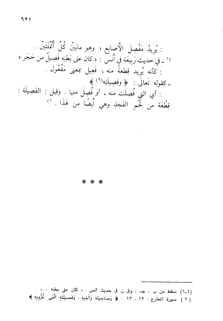: أي التي فُصِلَت منه، أو فُصِلَ منها. وقيل: الفَصِيلَة: قِطْعَة من لَحْمِ الفَخِذِ وهي أَيضًا من هَذَا. 1)