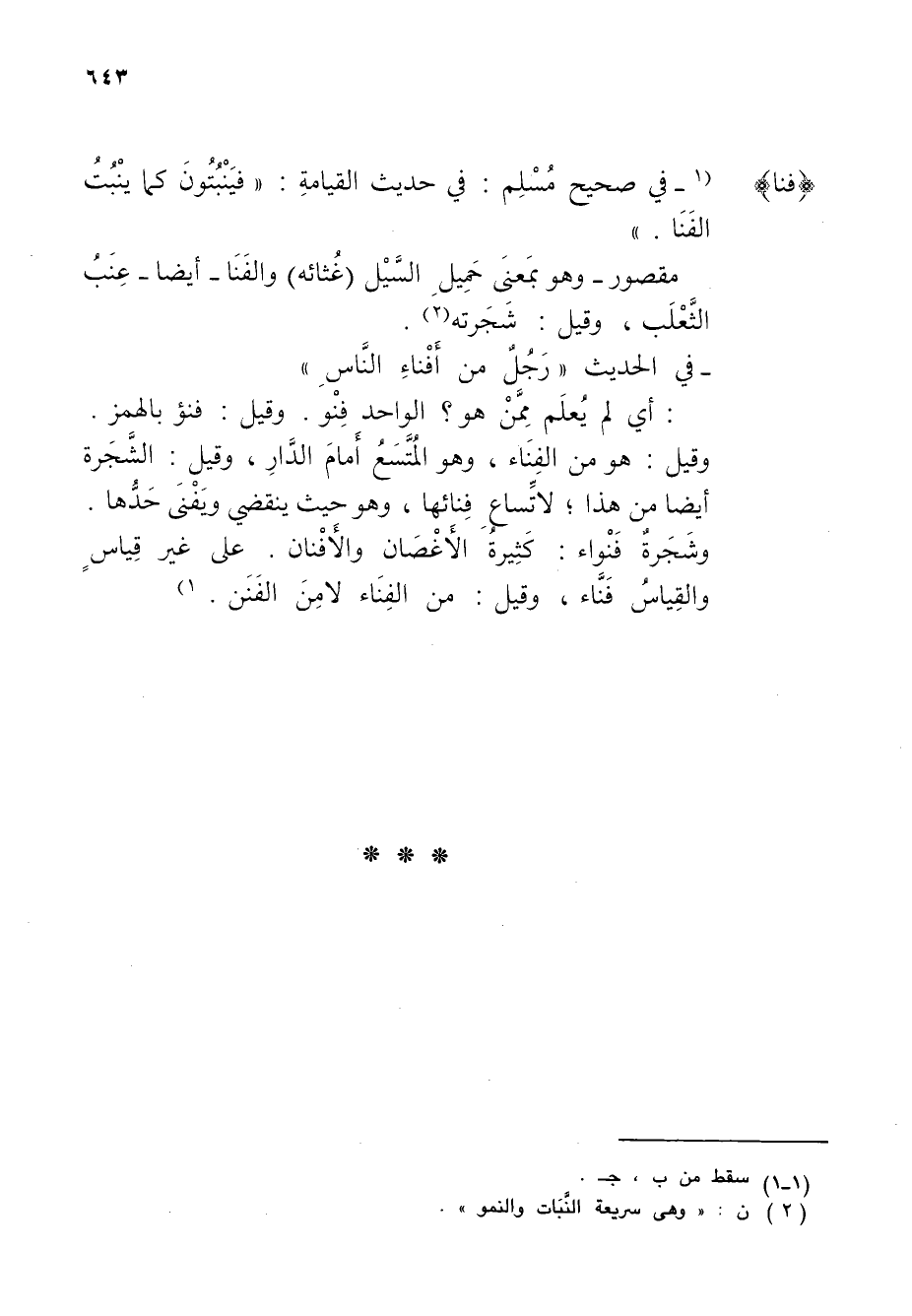 : أي لم يُعلَم مِمَّنْ هو؟ الواحد فِنْو. وقيل: فنؤ بالهمز. وقيل: هو من الفِنَاء، وهو المُتَّسَعُ أَمامَ الدَّارِ، وقيل: الشَّجَرة أيضا من هذا؛ لاتِّساعِ فِنائها، وهو حيث ينقضي ويَفْنَى حَدُّها. وشَجَرةٌ فَنْواء: كَثِيرةُ الأَغْصَان والأَفْنان. على غير قِياسٍ والقِياسُ فَنَّاء، وقيل: من الفِنَاء لا مِنَ الفَنَن. 1)