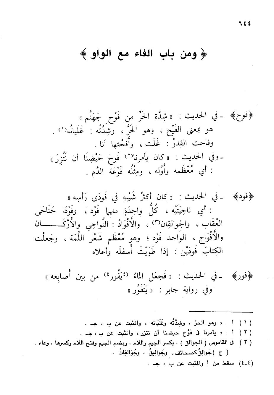 : أي ناحِيَتَيْه، كُلُّ واحِدَةٍ منهما فَوْد، وفَوْدَا جَنَاحَى العُقَاب، والجوالِقان (¬3)، والأَفْوَادُ: النَّواحِي والأَرْكَان والأَفْوَاج، الوَاحد فَوْد؛ وهم مُعْظَم شَعْر اللِّمَة، وجَعلْت الكِتابَ فَودَيْن: إذا طَوَيْتَ أَسفلَه وأعلاه