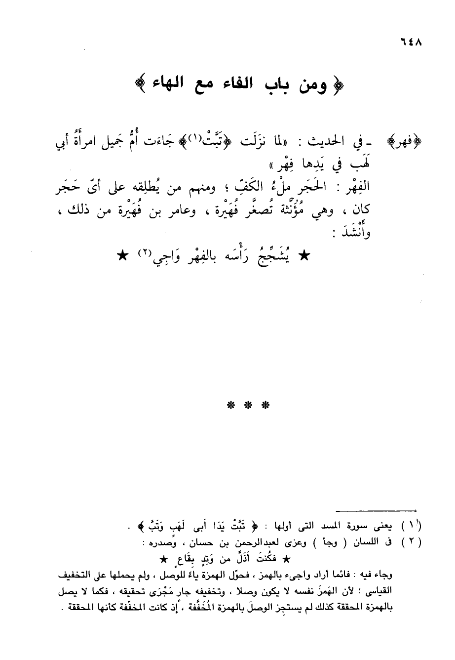 (فهر) - في الحديث: "لما نزَلَت {تَبَّتْ} (¬1) جَاءَت أُمُّ جَميل امرأَةُ أبي لَهَب في يَدِها فِهْر"