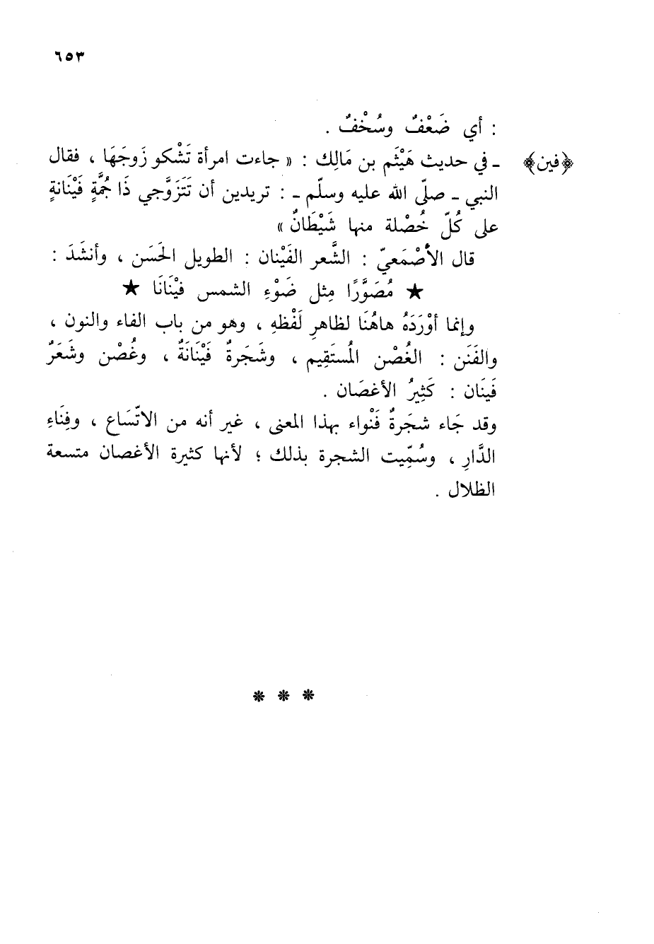 وإنما أوْرَدَهُ ها هُنَا لظاهرِ لَفْظهِ، وهو من باب الفاء والنون، والفَنَن: الغُصْن المُستَقِيم، وشَجَرةٌ فَيْنَانَةٌ، وغُصْن وشَعَرٌ فَينَان: كَثِيرُ الأغصَان.