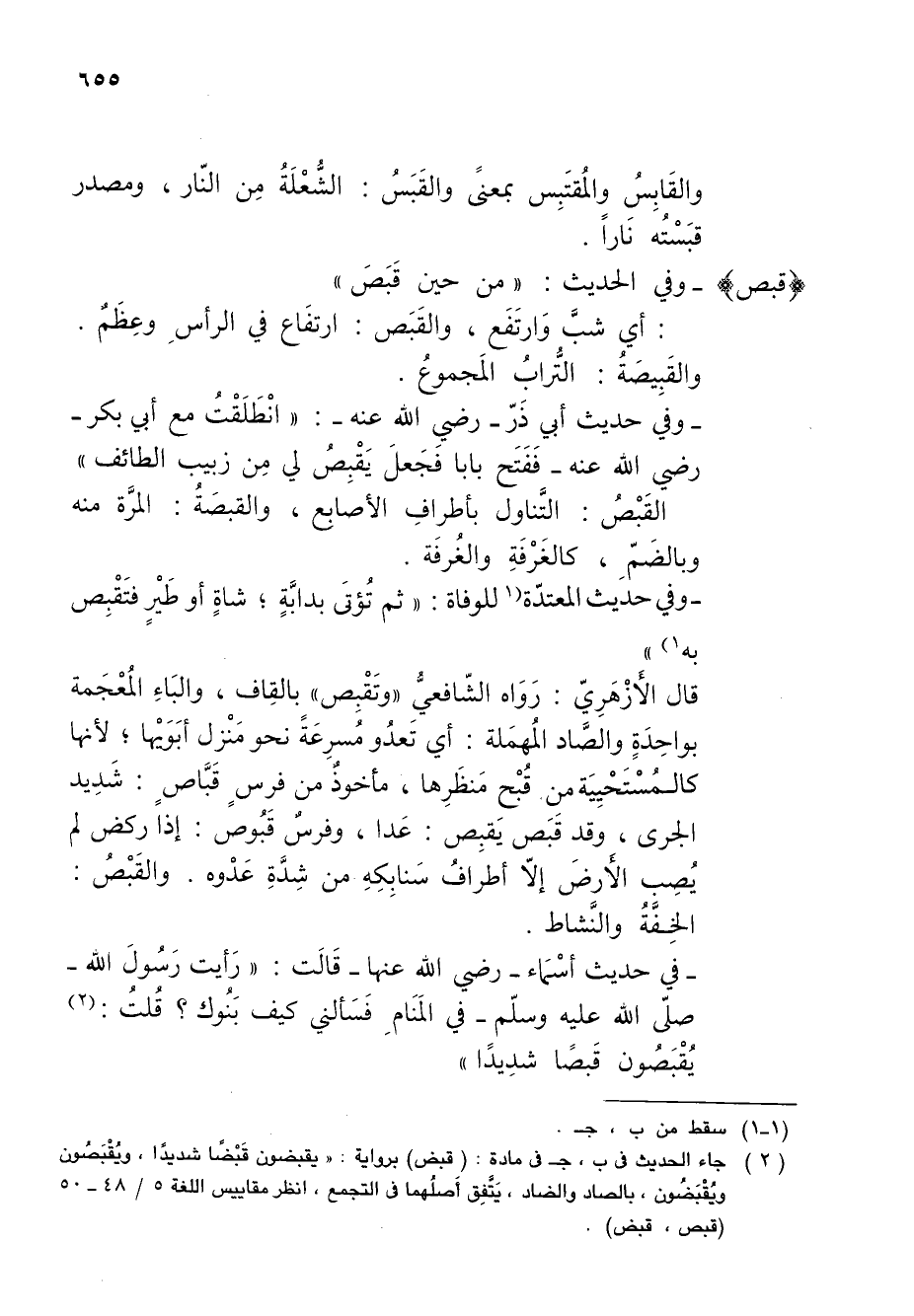 (¬2) جاء الحديث في ب، جـ في مادة: (قبض) برواية: "يقبضون قَبْضًا شديدًا، ويُقْبَصُون ويُقْبَضُون، بالصاد والضاد، يَتَّفِق أَصلُهما في التجمع، انظر مقاييس اللغة 5/ 48 - 50 (قبص، قبض).