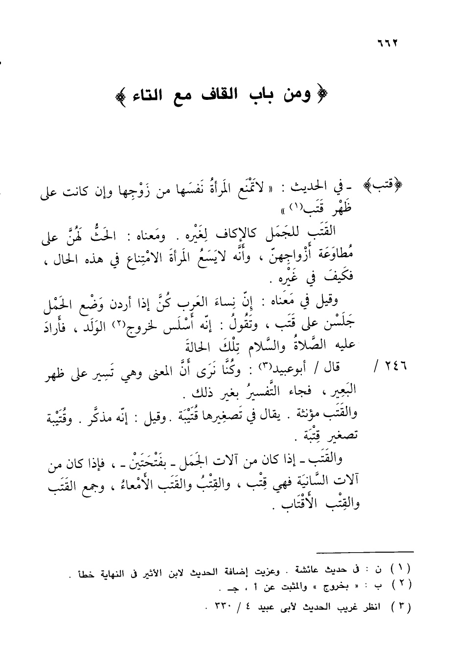 (قتب) - في الحديث: "لا تَمْنَع المَرأةُ نَفسَها من زَوْجِها وإن كانت على ظَهْر قَتَب (¬1) "
