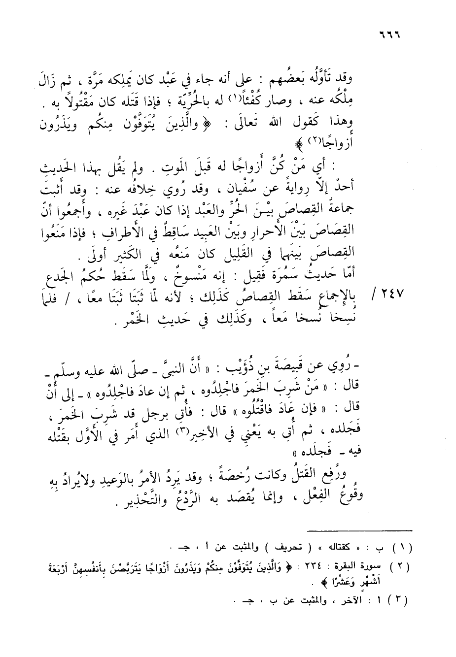 وقد تَأوَّلُه بَعضُهم: على أنه جاء في عَبْد كان يَملِكه مَرَّة، ثم زَالَ مِلْكُه عنه، وصار كُفْئاً (¬1) له بالحُرِّيّة؛ فإذا قَتَله كان مَقْتُولاً به. وهذا كَقول الله تَعالَى: {وَالَّذِينَ يُتَوَفَّوْنَ مِنْكُمْ وَيَذَرُونَ أَزْوَاجًا} (¬2): أي مَنْ كُنَّ أَزواجًا له قَبلَ المَوتِ. ولم يَقُل بهذا الحَديثِ أحدٌ إلّا رِوايةً عن سُفْيان، وقد رُوي خِلافُه عنه: وقد أَثبتَ جماعةٌ القِصاصَ بيْنَ الحُرِّ والعَبْد إذا كان عَبْدَ غَيره، وأَجمعُوا أنّ القِصاصَ بَيْنَ الأَحرارِ وبَيْن العَبِيد سَاقِطٌ في الأَطرافِ؛ فإذا مَنَعُوا القِصاصَ بَينَهما في القَلِيل كان مَنعُه في الكَثير أولَى.