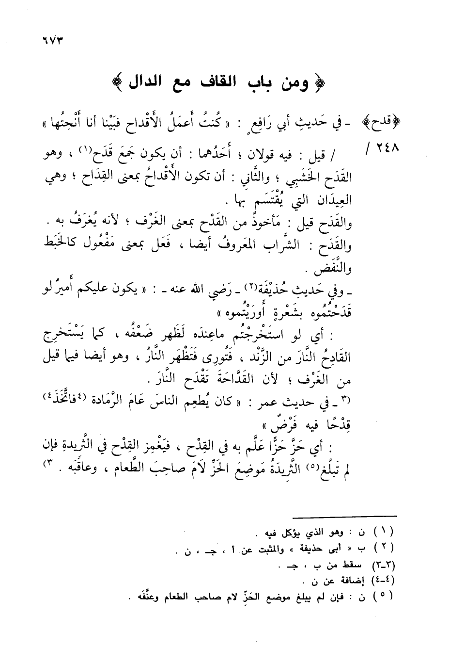 (3 - في حديث عمر: "كان يُطعِم الناسَ عَامَ الرَّمَادة (4 فاتَّخَذَ 4) قِدْحًا فيه فَرْضٌ"
