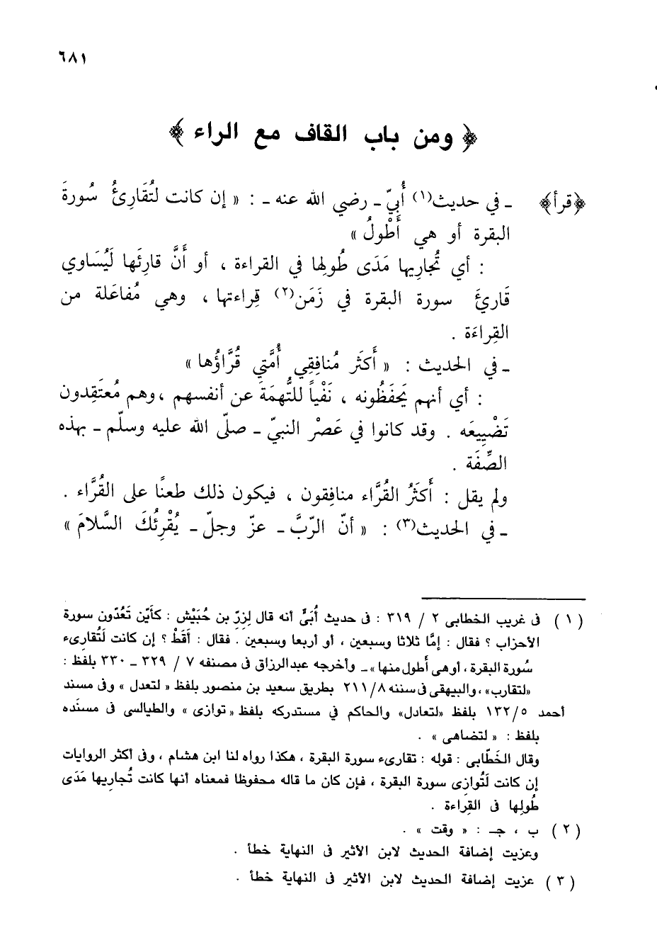 (¬1) في غريب الخطابى 2/ 319: في حديث أُبَىٍّ أنه قال لِزِرِّ بن حُبَيْش: كأَيّن تَعُدّون سورة الأحزاب؟ فقال: إمَّا ثلاثا وسبعين، أو أربعا وسبعين. فقال: أَقَطْ؟ إن كانت لَتُقارِئ سُورة البقرة، أو هي أَطول منها" - وأخرجه عبد الرزاق في مصنفه 7/ 329 - 330 بلفظ: "لتقارب"، والبيهقى في سننه 8/ 211 بطريق سعيد بن منصور بلفظ "لتعدل" وفي مسند أحمد 5/ 132 بلفظ "لتعادل" والحاكم في مستدركه بلفظ "توازى" والطيالسى في مسنَده بلفظ: "لتضاهى".