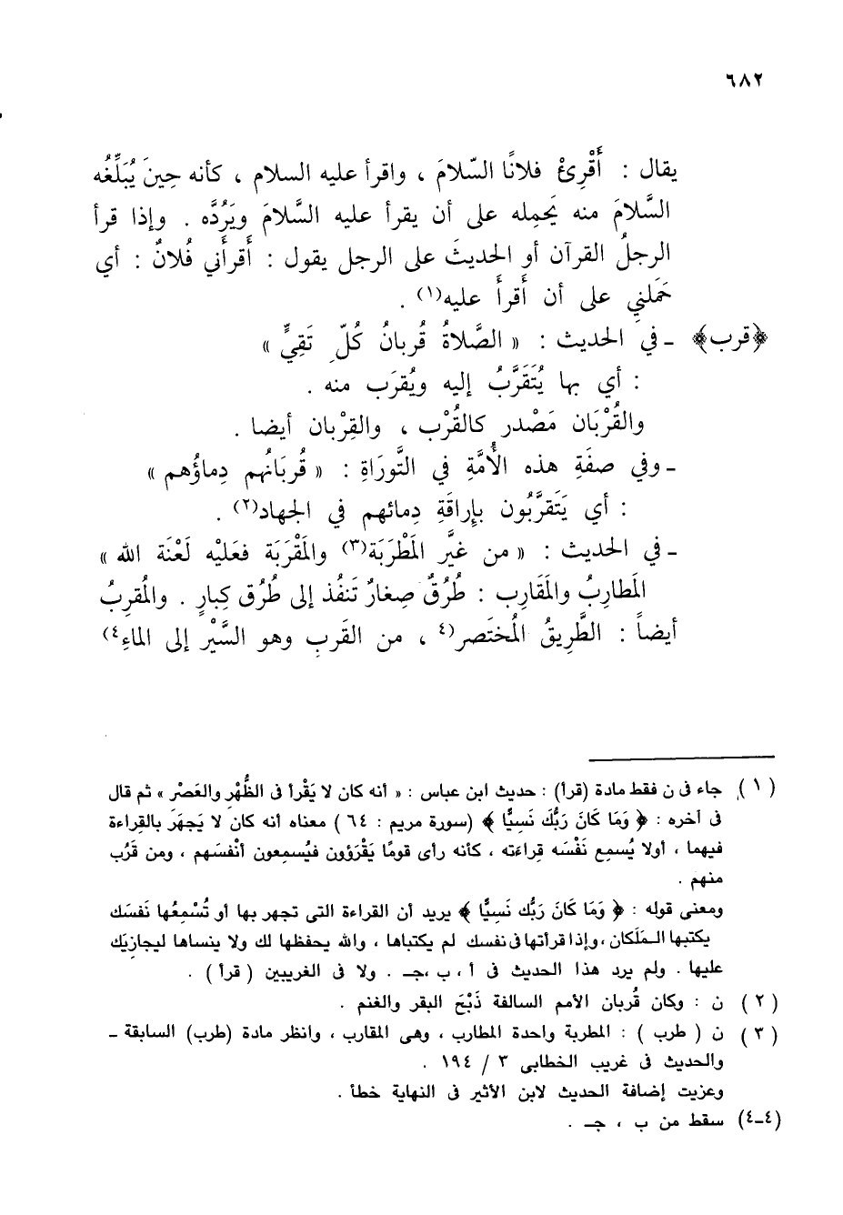 (¬1) جاء في ن فقط مادة (قرأ): حديث ابن عباس: "أنه كان لا يَقْرأ في الظُّهْرِ والعَصْر" ثم قال في آخره: {وَمَا كَانَ رَبُّكَ نَسِيًّا} (سورة مريم: 64) معناه أنه كان لا يَجهَر بالقِراءة فيهما، أو لا يُسمِع نَفْسَه قِراءَته، كأنه رأى قومًا يَقْرَؤون فيُسمِعون أنْفسَهم، ومن قَرُب منهم.
