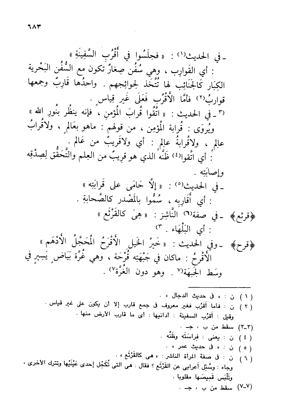 : أي القَوارِب، وهي سُفُن صِغارٌ تكون مع السُّفُن البَحْرية الكِبَار كَالجَنَائِب لها تُتَّخَذ لِحوائِجهم. واحدُها قَارِبٌ وجمعها قواربُ (¬2) فأمَّا الأَقْرُب فَعَلَى غير قِياسٍ.