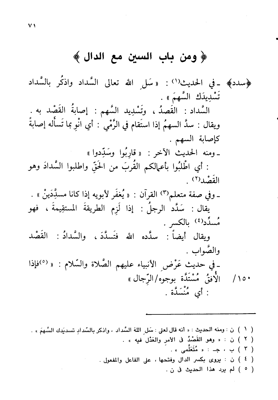 (¬1) ن: ومنه الحديث: "أنه قال لعلى: سَلِ اللهَ السَّداد، واذكر بالسّدادِ تسديَدك السَّهمَ".