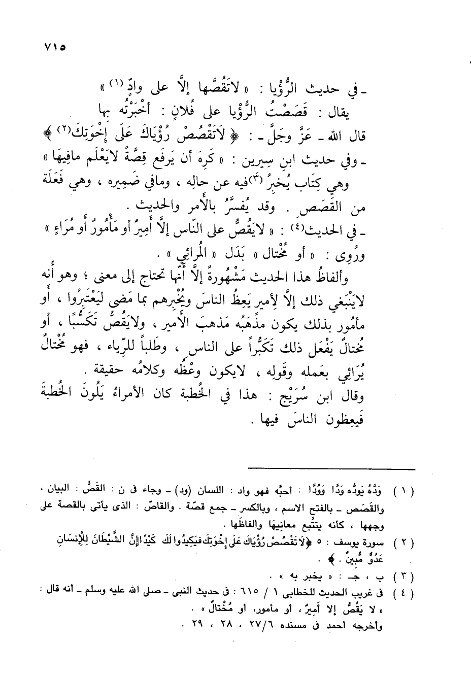 (¬4) في غريب الحديث للخطابى 1/ 615: في حديث النَّبيُّ - صلى الله عليه وسلم - أنه قال: "لا يَقُصُّ إلا أَمِيرٌ، أو مأمور، أو مُخْتالٌ".