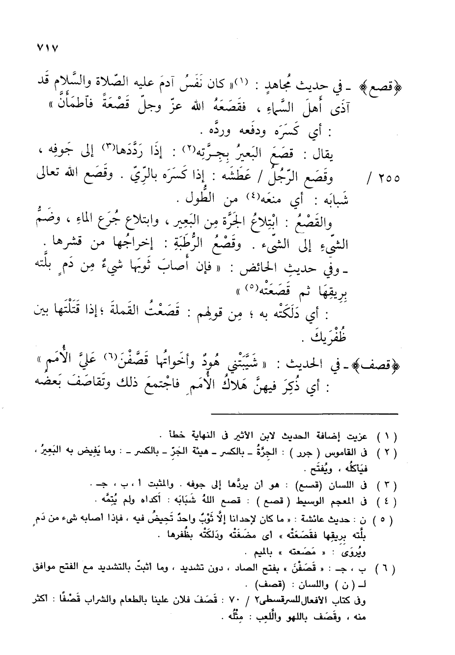 (¬5) ن: حديث عائشة: "ما كان لإحدانا إلَّا ثَوْبٌ واحدَ تَحِيضُ فيه، فإذا أصابه شىء من دَمٍ بلَّته بِرِيقِها فقَصَعَتْه" أي مضَغَتْه ودَلكَتْه بظُفرها.