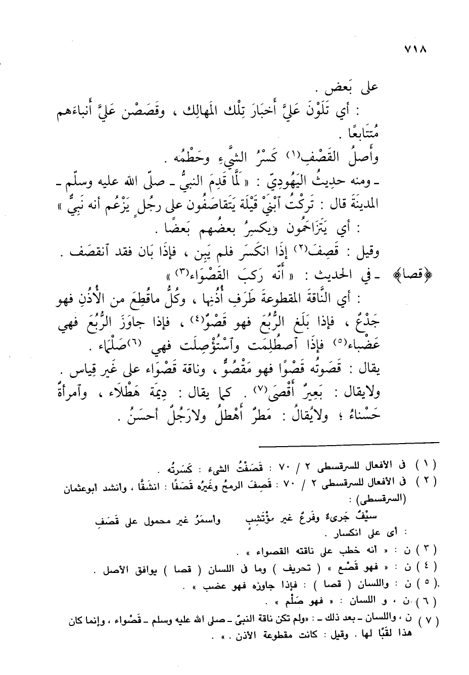 (¬7) ن، واللسان - بعد ذلك -: "ولم تكن ناقة النَّبيُّ - صَلَّى الله عليه وسلم - قَصْواء، وإنما كان هذا لقَبًا لها. وقيل: كانت مقطوعة الأذن.".